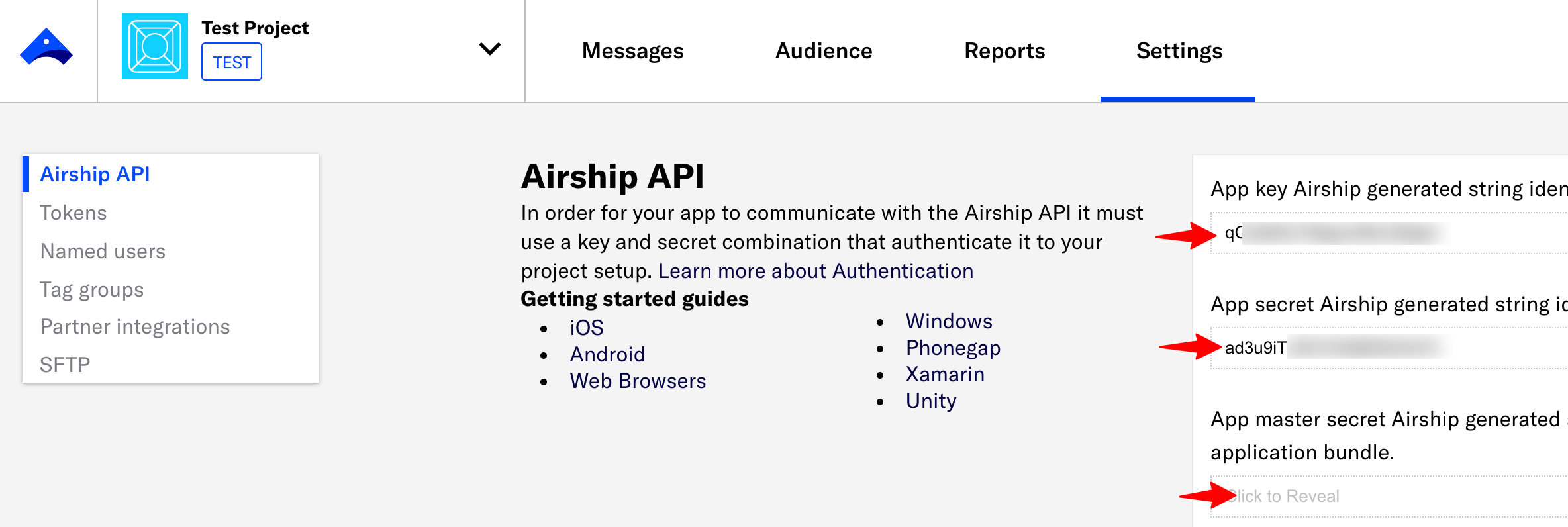 - In the Airship project dashboard, select Settings > APIs & Integrations.