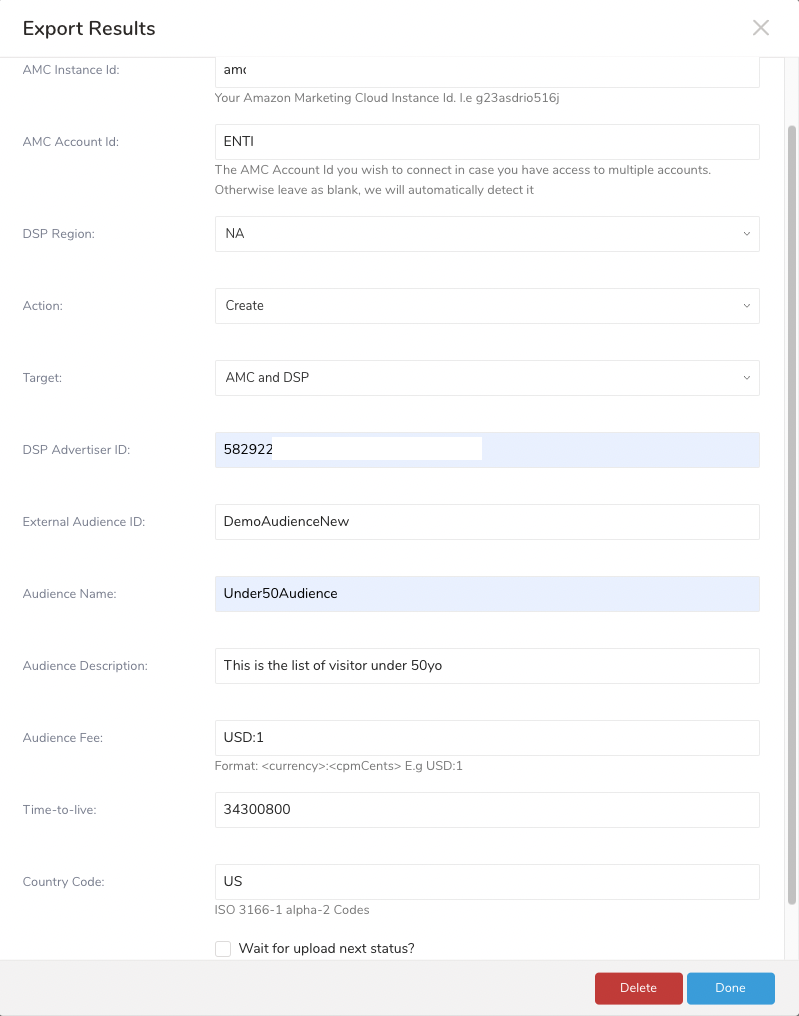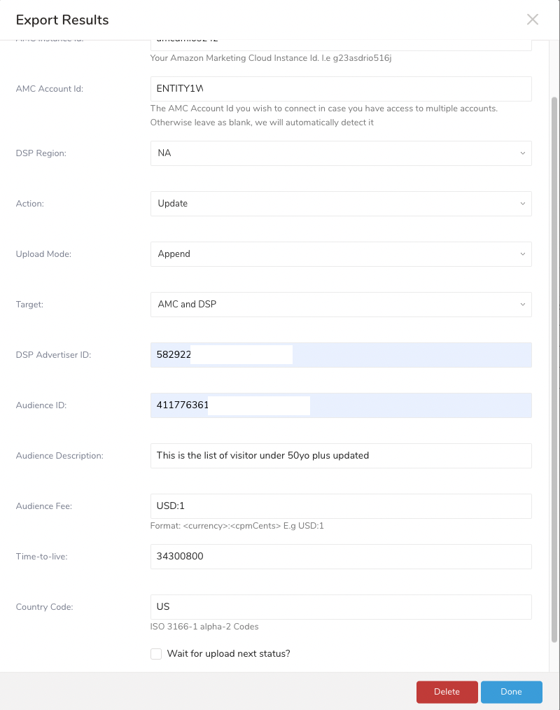 --result '{"type":"amazon_ads","td_authentication_id":"${authentication_id_from_td_console}","amc_instance_id":"amc_instance_id","amc_account_id":"amc_account_id","region":"NA","action":"CREATE","upload_mode":"APPEND","target":"AMC_AND_DSP","dsp_advertiser_id":"dsp_advertiser_id","external_audience_id":"external_audience_id","audience_name":"audience_name","time_to_live":34300800,"country_code":"US","wait_until_finish":false,"max_wait_time":1}'See Amazon Advertiser Audience APIs for additional information.