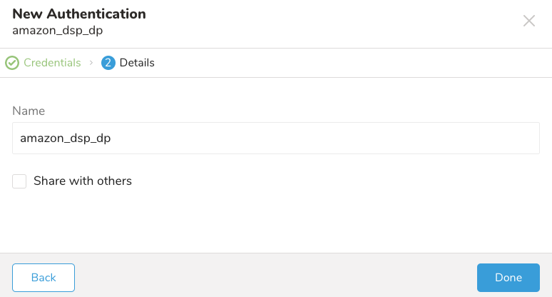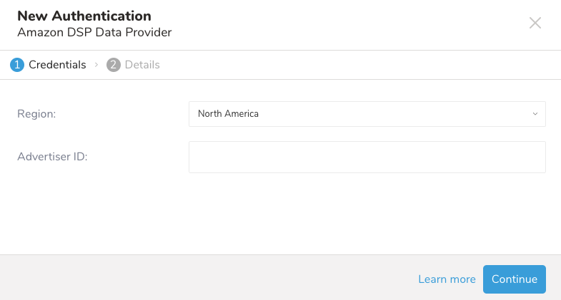 - Hover over the Amazon DSP Data Provider connector and select Create Authentication.