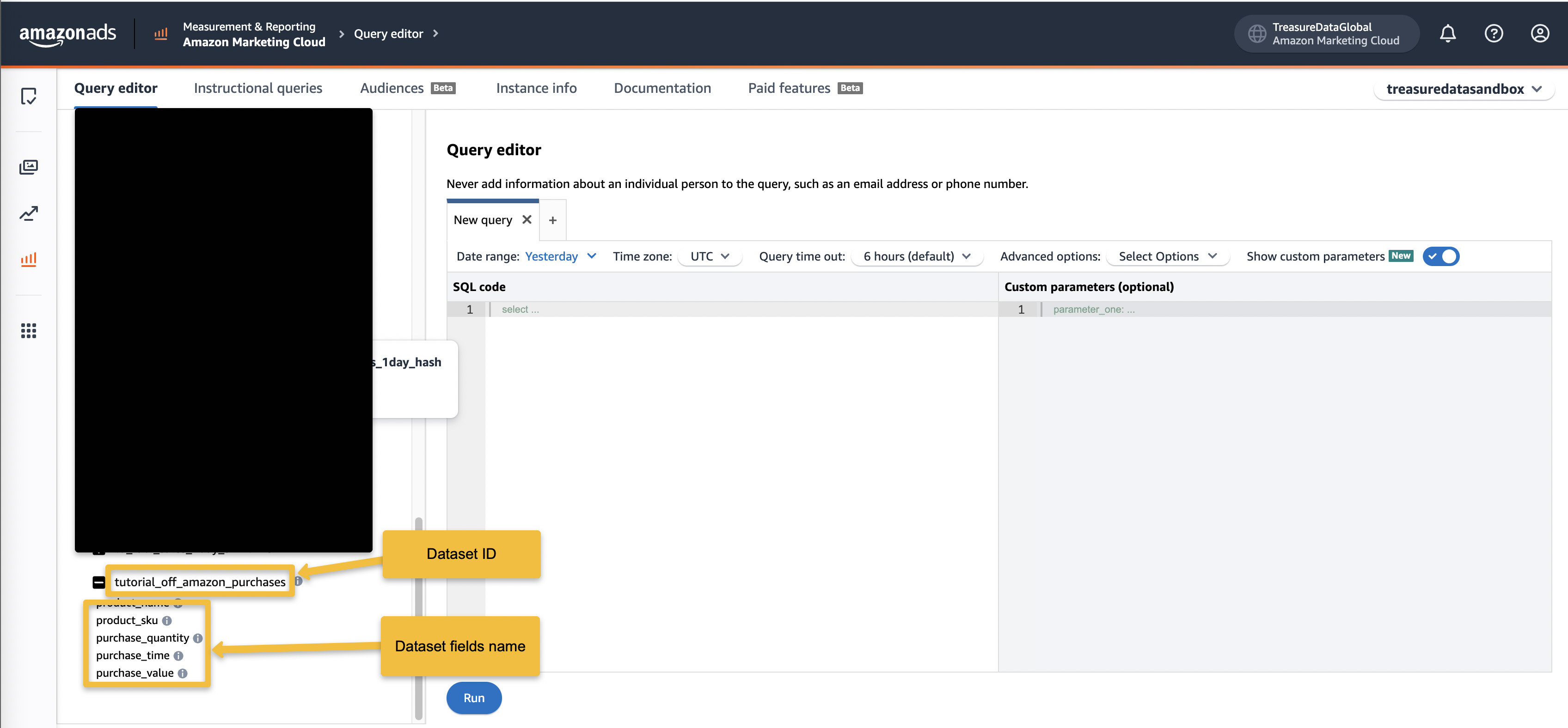 - From the Amazon Query editor page, you can obtain the Dataset ID and Dataset Fields Name.