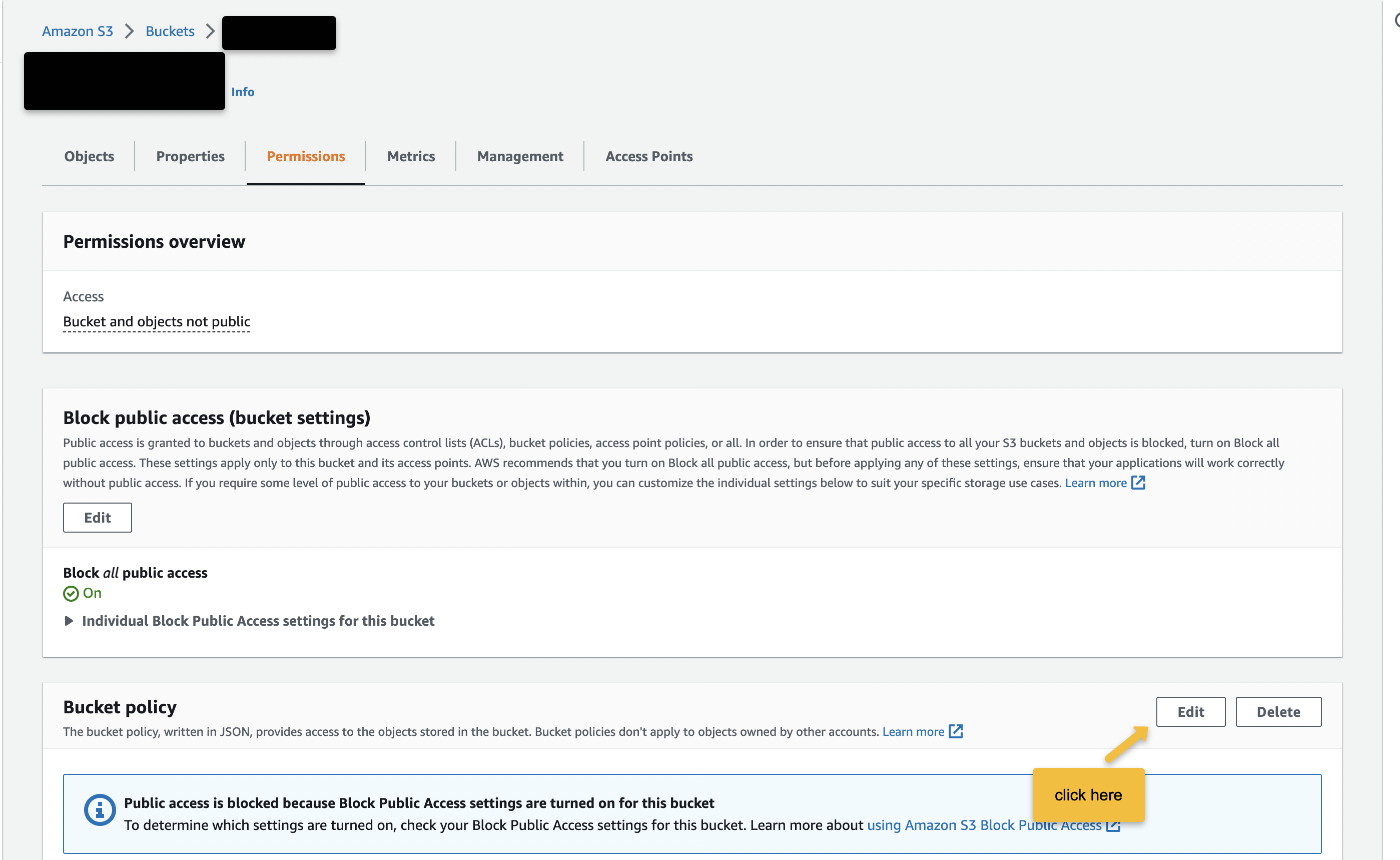 - Log in to S3, navigate to your bucket > permission tab, and select Edit beneath the Bucket policy.