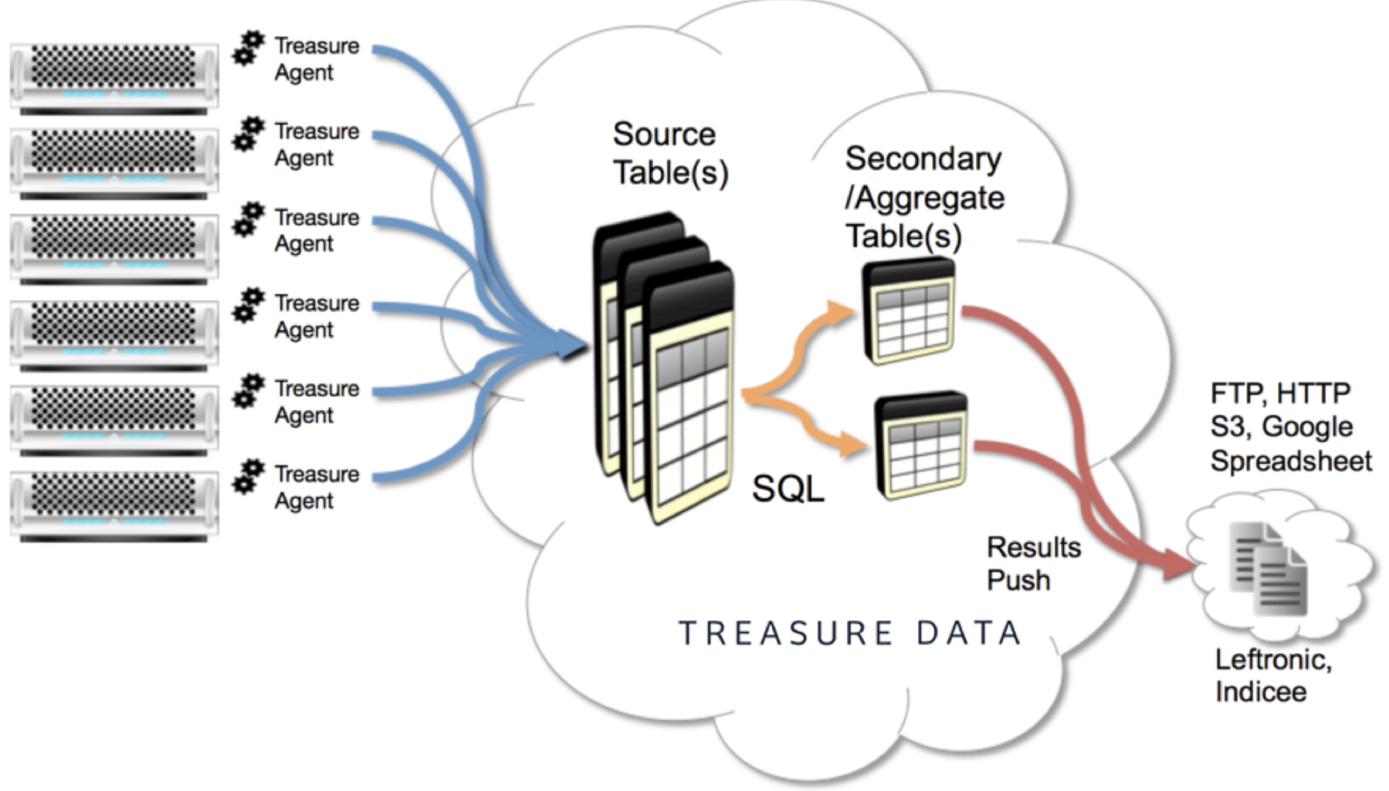 A front-end application streams data to be collected in Treasure Data via Treasure Agent (td-agent). Treasure Data periodically runs jobs on the data, then writes the job results to your Redshift cluster.
