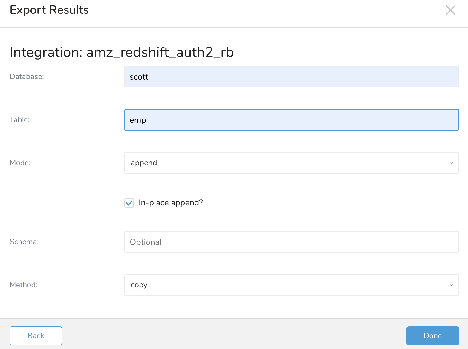--result 'redshift://username:password@host.redshift.amazonaws.com/database/table?mode=replace' \