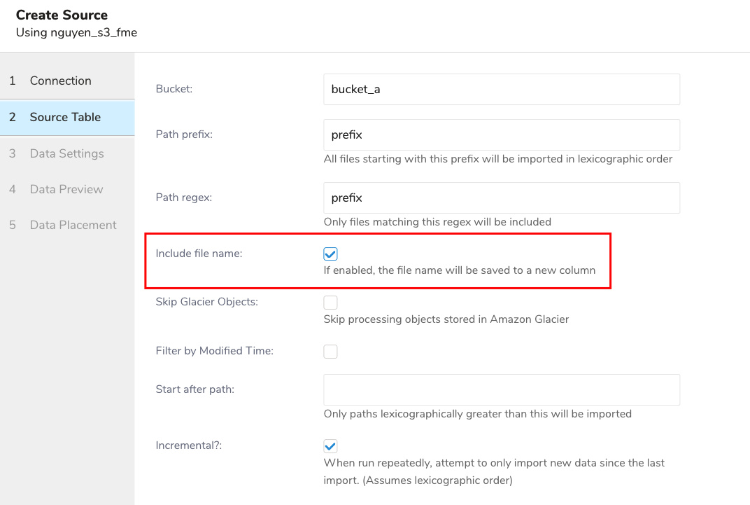 | Path Regex | Use regexp to match file paths. The file is skipped if a file path doesn't match the specified pattern. For example, if you select the pattern .csv$ #, a file is skipped if its path doesn't match the pattern. Read more about regular expressions. |