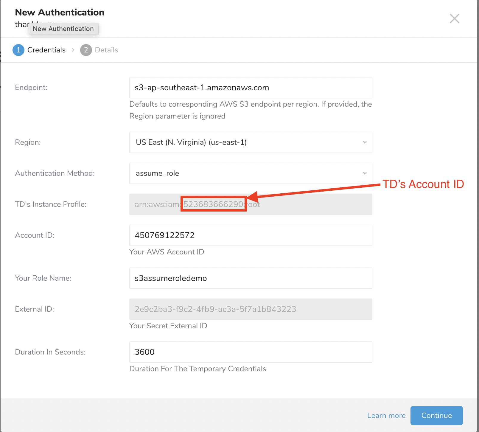 Follow the steps in Importing from AWS S3 using TD Consoleto create an authentication.