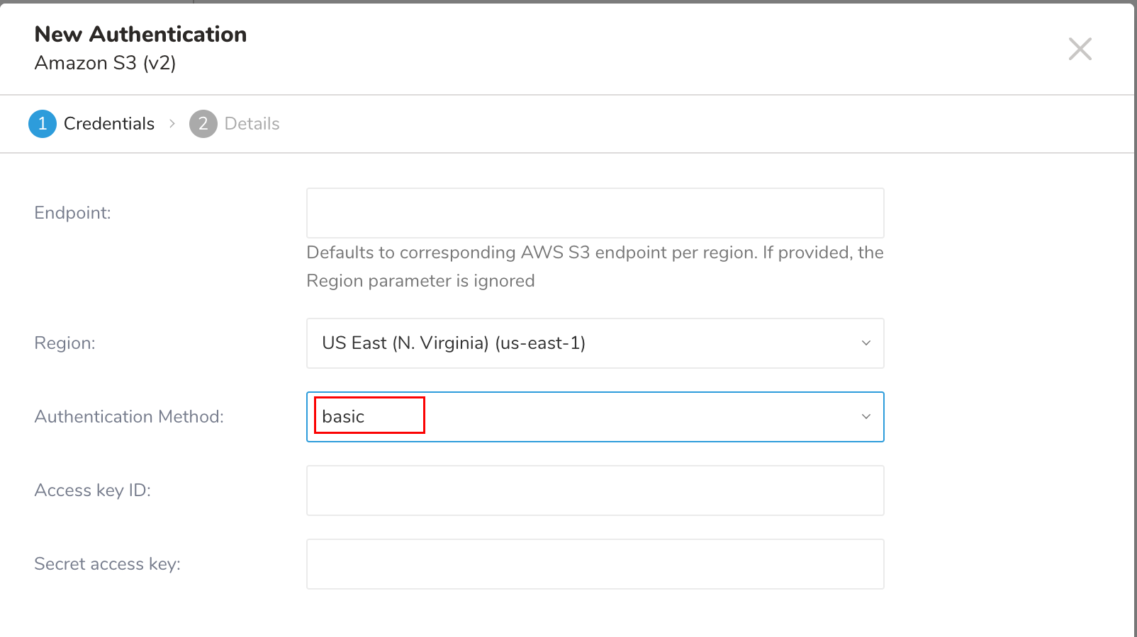 Review the information in the following table to understand the authentication differences between v2 and v1. For v1 details, see Amazon S3 Import Integration v1.