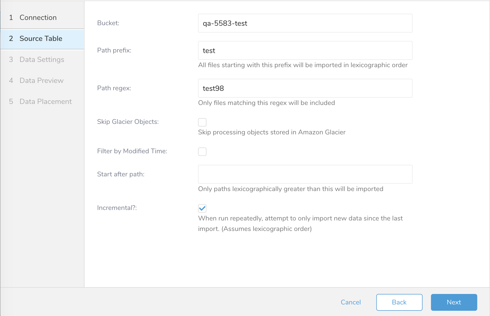 [your_bucket] - [logging] - [E231A697YXWD39.2017-04-23-15.a103fd5a.gz][your_bucket] - [logging] - [E231A697YXWD39.2017-04-23-15.b2aede4a.gz][your_bucket] - [logging] - [E231A697YXWD39.2017-04-23-16.594fa8e6.gz][your_bucket] - [logging] - [E231A697YXWD39.2017-04-23-16.d12f42f9.gz]In this case, the Source Table settings are as shown: