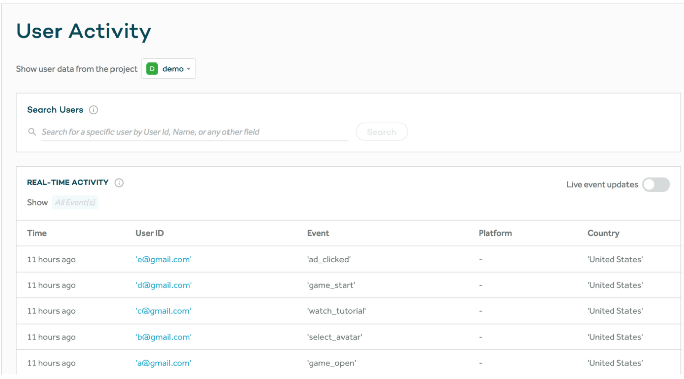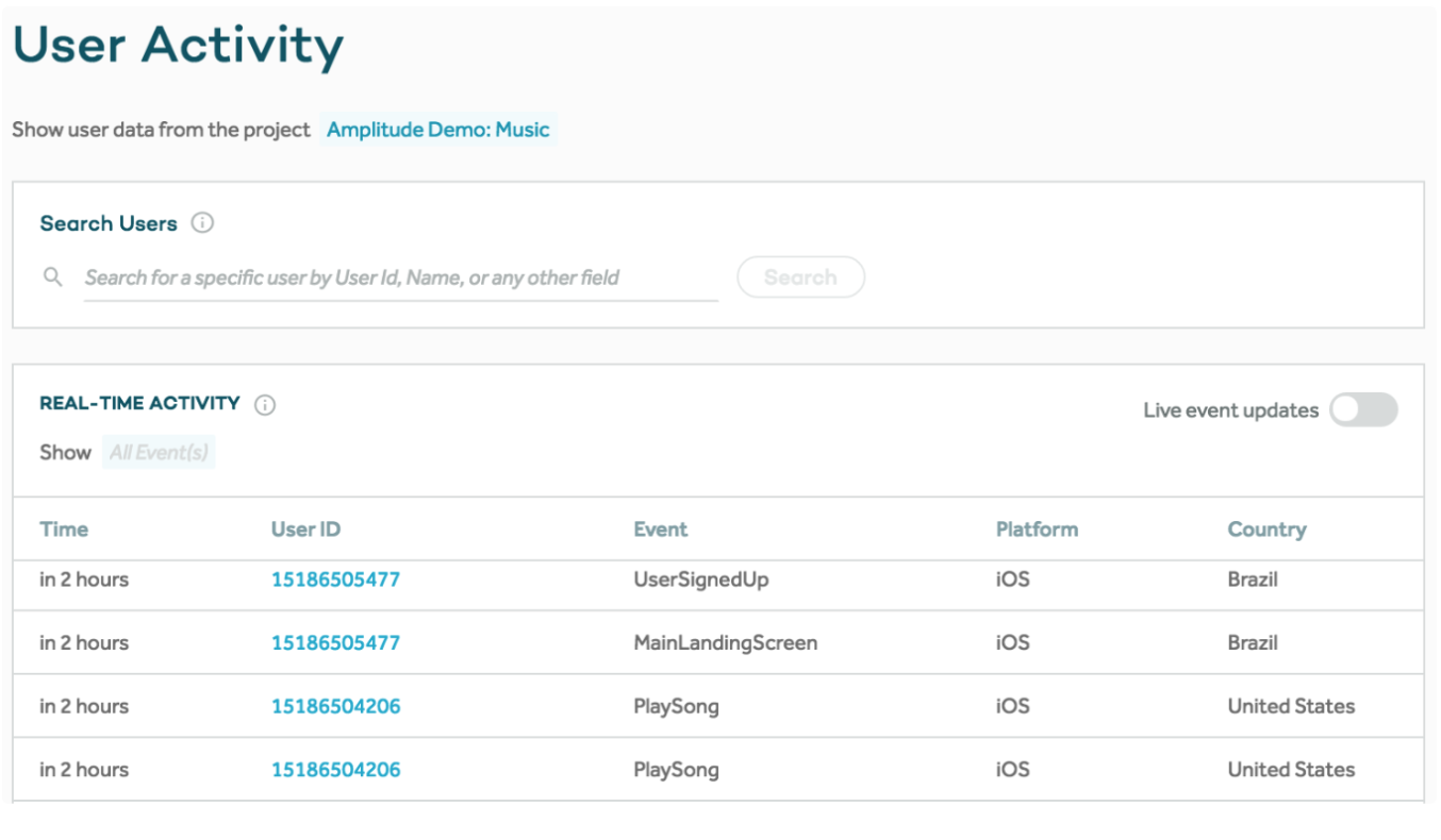 In the Amplitude console, you can view User Activity to explore Amplitude events: