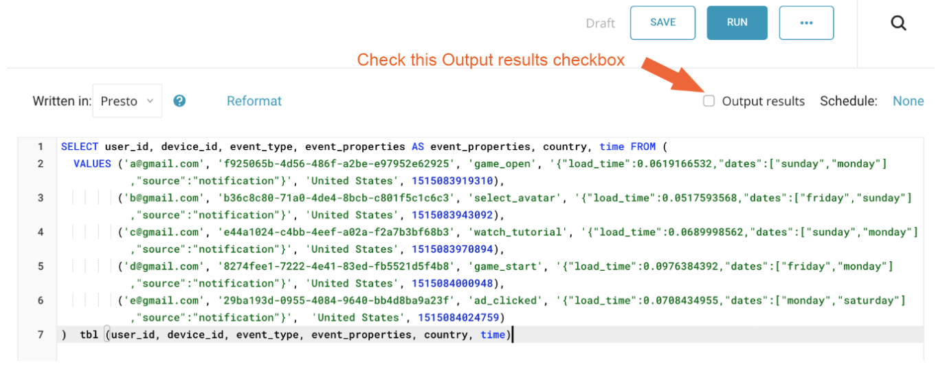 Go to the TD Console, and Queries and select New Query to access the query editor. You can pick the query language and write your query. Select Output results.