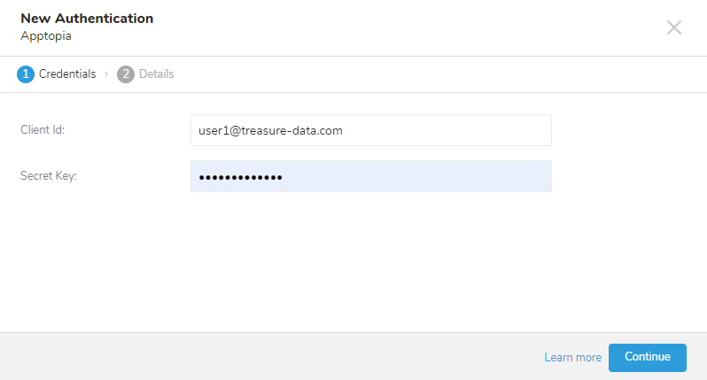 Edit your Apptopia Client ID and Secret Key information. Then click Continue. Give your connection a name, and click Done.