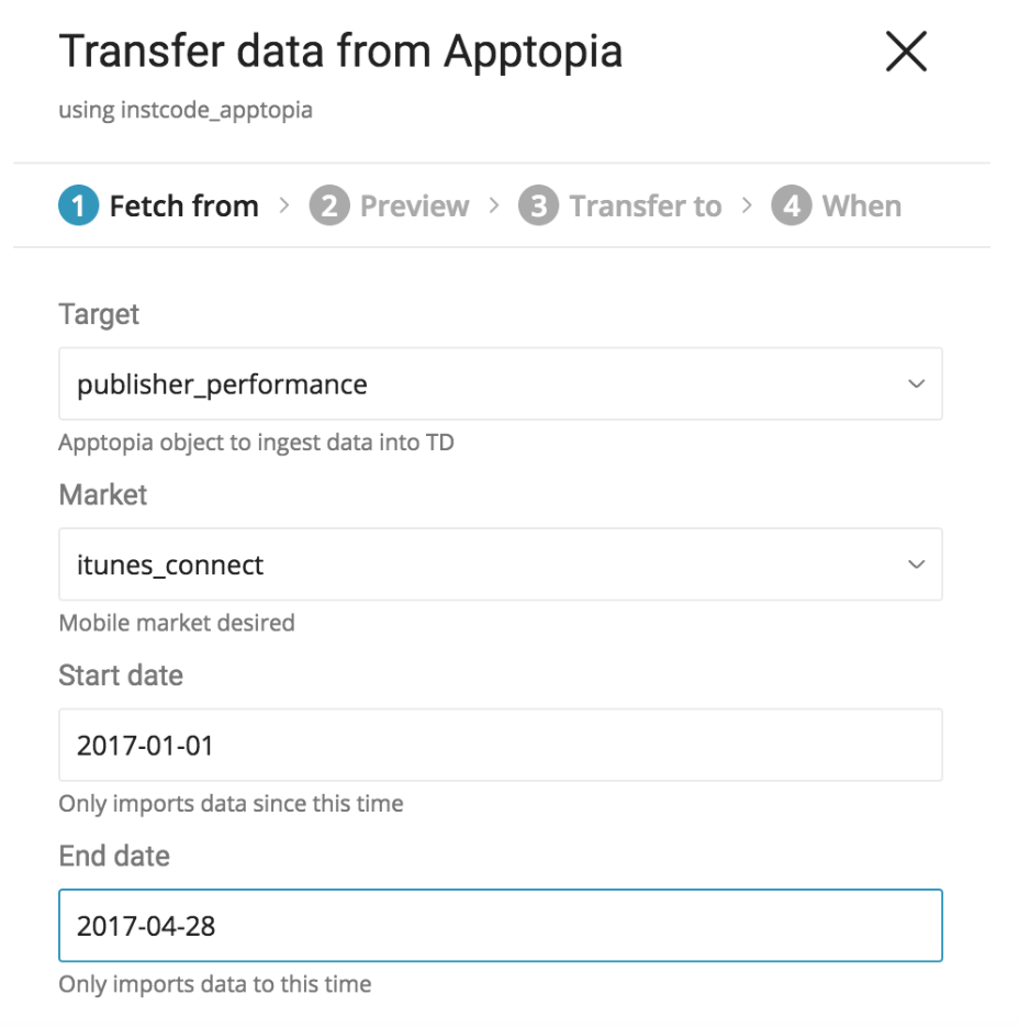 This Data Connector allows you to import Apptopia Data Source objects into Treasure Data.