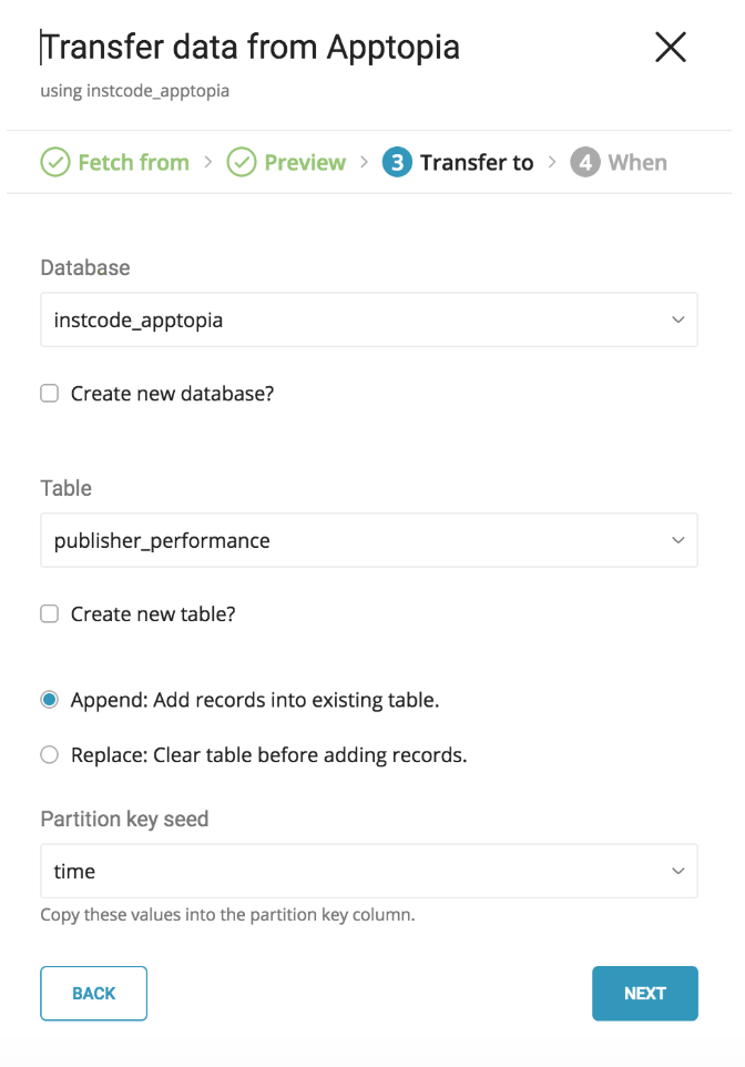 If you have multiple transfers under the same Apptopia account, you can control the rate limit usage of each transfer via requests_per_minute_limit in advanced settings as long as the total limit does not exceed your account limit. For example, assume that your account has quotas as 1000 calls/minute, if you create 2 transfers, e.g. app_performance & publisher_performance targets, you could use 600 rpm for app_performance transfer and the rest (400 rpm) for publisher_performance transfer.
