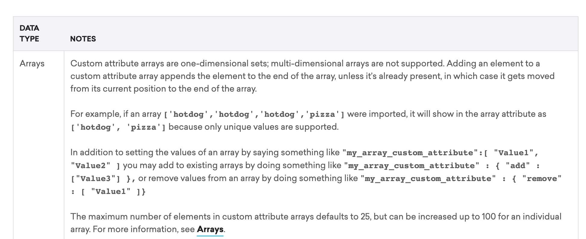 What if you want to opt in / opt out after the user has already been there? Intuitively, you will want to append or remove element(s) from that array attribute. Braze API supports these operations: API User attributes object.