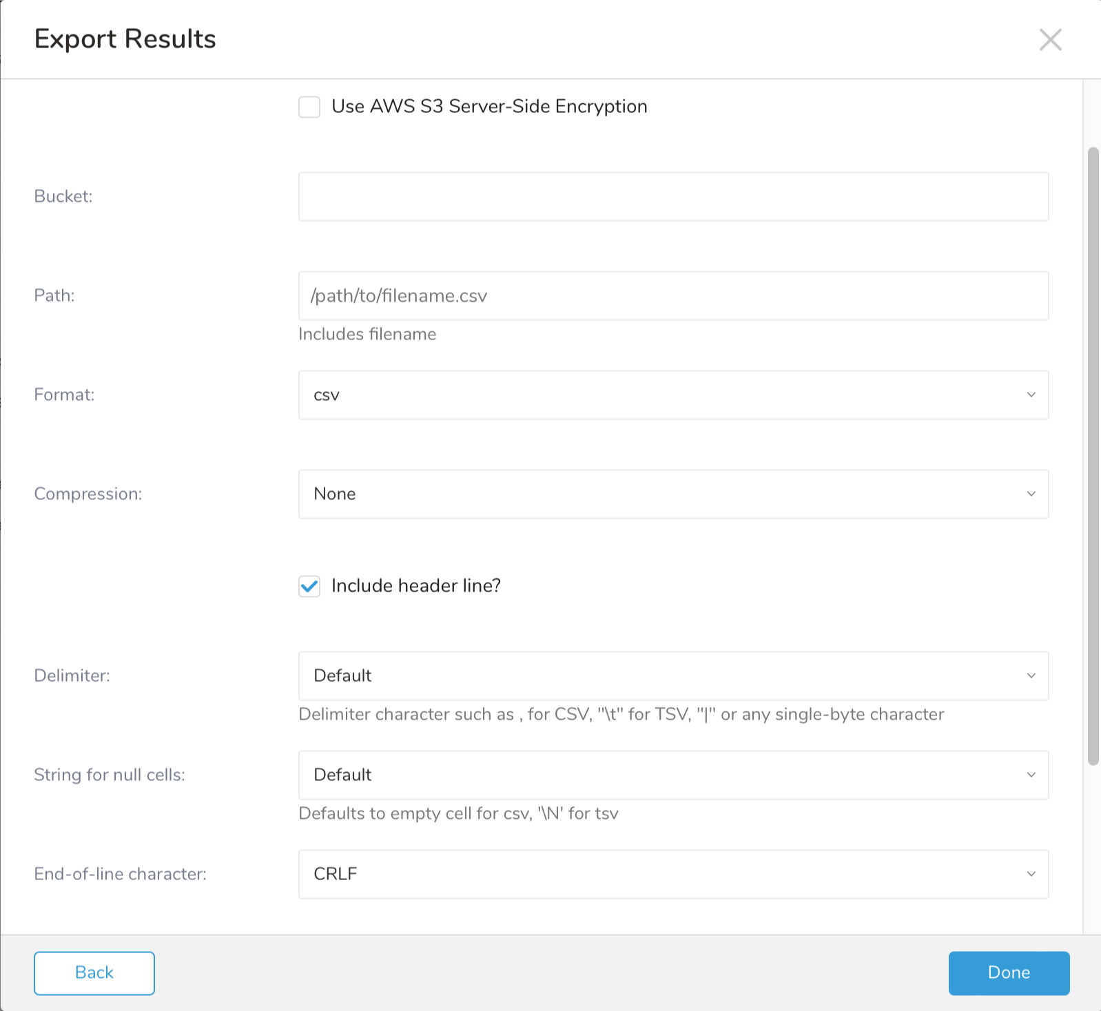 - Define any additional Export Results details. In your export integration content review the integration parameters. For example, your Export Results screen might be different, or you might not have additional details to fill out: