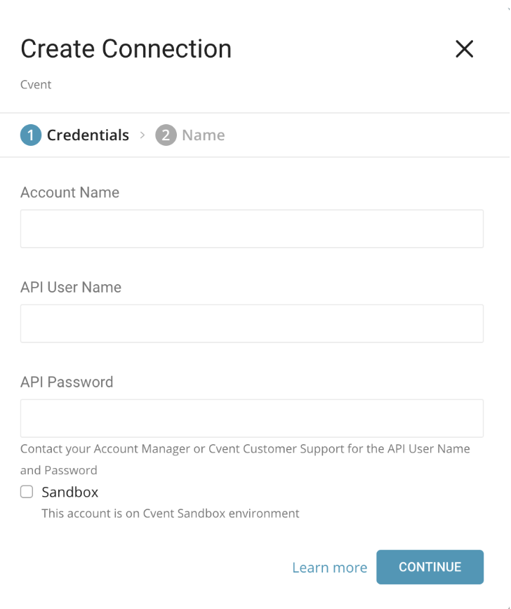 The API User Name and API Password are different from the Cvent application username and password, so contact your Cvent admin to generate an API User Name and API Password.