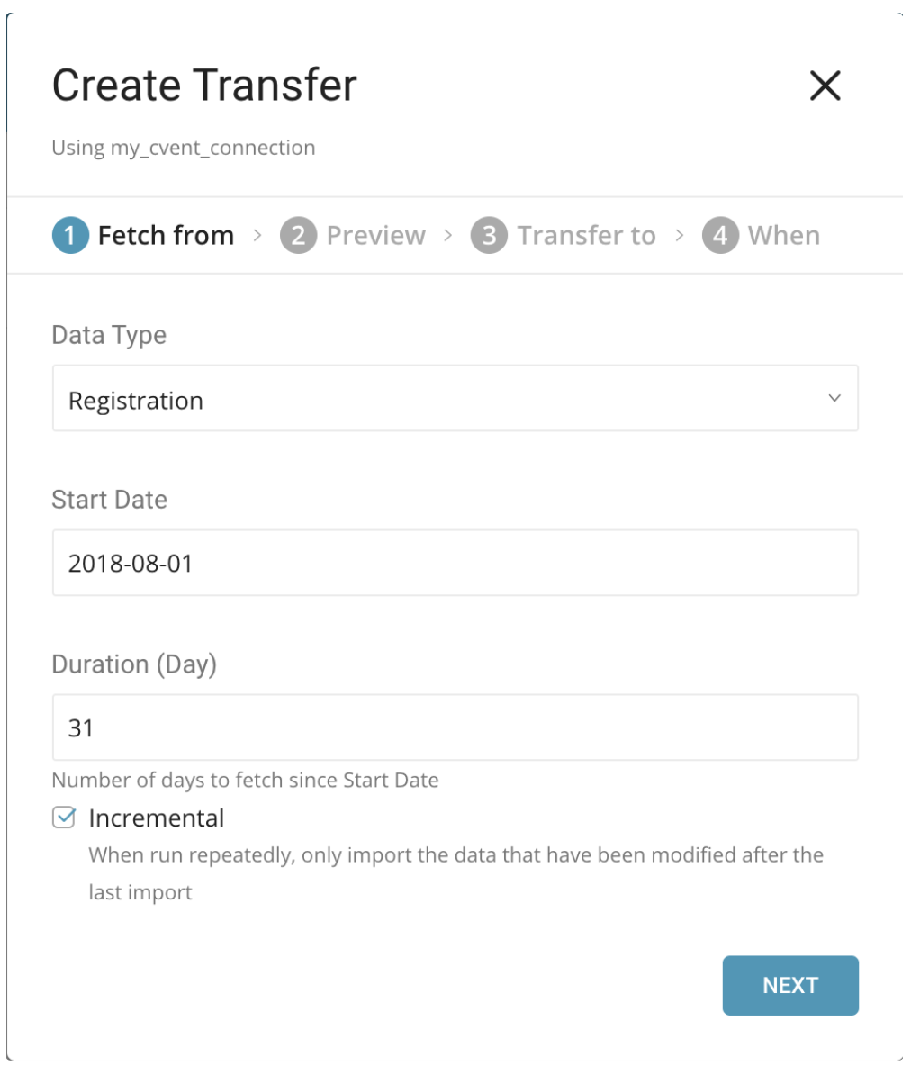 Incremental: When running on schedule, the time window of the fetched data automatically shifts forward on each run. For example, if the initial config is January 1, with 10 days in duration, the first run fetches data that was modified from January 1 to January 10, the second run fetches data that was modified from January 11 to January 20, and so on.