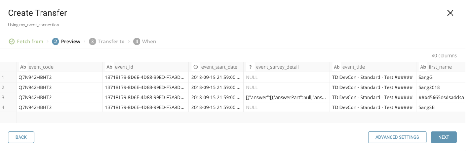 This shows a preview of the actual data in the specified data transfer configuration. The columns are sorted alphabetically, but custom field columns (if there are any) are placed at the end. This order also applies to the final results on the target database.