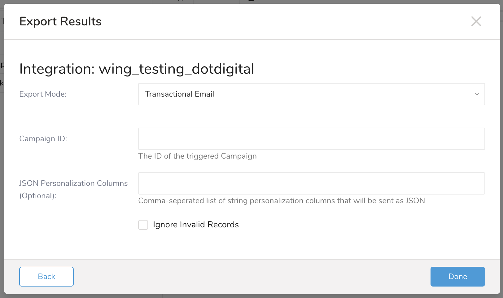 | Export Mode | Required | There are three different ways to move data: - Transactional Email (default). Trigger send emails for the triggered campaign in Dotdigital: send one email for each record. - Bulk Contacts: Upload records as contacts to Dotdigital. - Unified Contacts: Upload/Delete records as contacts to Dotdigital. An enhanced version of Bulk Contacts that enable contacts and their dependencies to be uploaded/deleted in one go. |