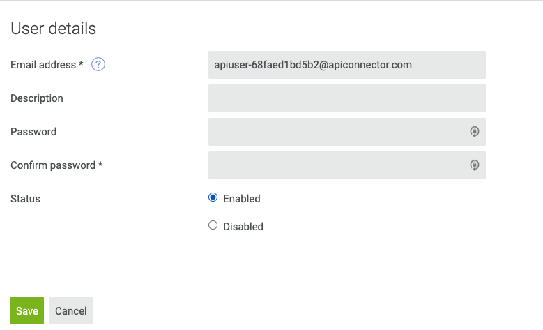 Select New user. DotDigital provides you with an email address. Complete the form by adding and confirming a password; a description is optional.