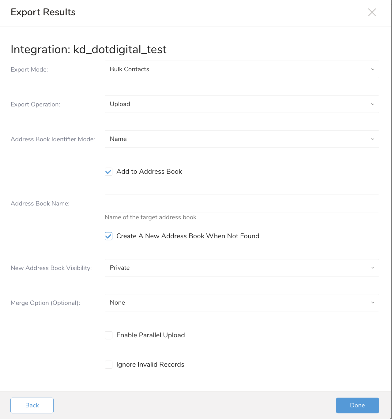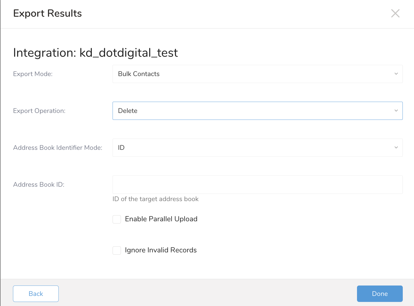 | Export Operation | Required | Export operation in bulk contacts mode - Upload (default). Upload records. - Delete. Delete contact from address book by id |