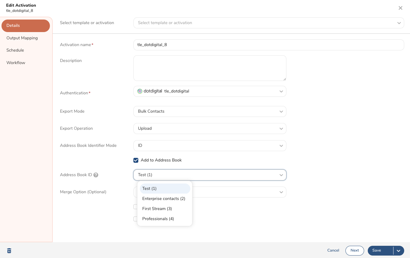 | Address Book ID | Optional | Address book ID to interact with. This parameter is required in following situations: - Export Operation is "Upload" and "Add to Address Book" is enabled - Export Operation is "Delete" |