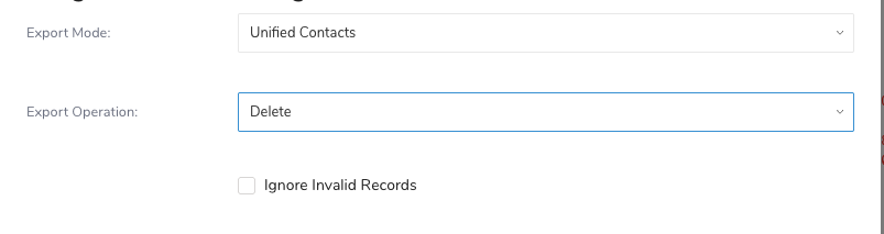 | Export Operation | Required | Export operation in unified contacts mode - Upload (default). Upload records as unified contacts. - Delete. Delete contacts (hard delete) |