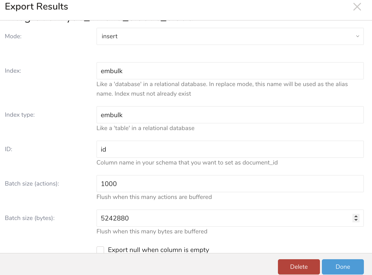 | ID | A column containing each name for each row/record. In Elastic Cloud result export, this setting is optional. | - (optional) the name of the ID column |