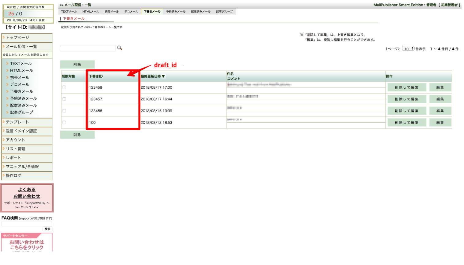 - To use "send_email" option, you need to get draft ID which is seen on here (メール配信・一覧 > 下書きメール)