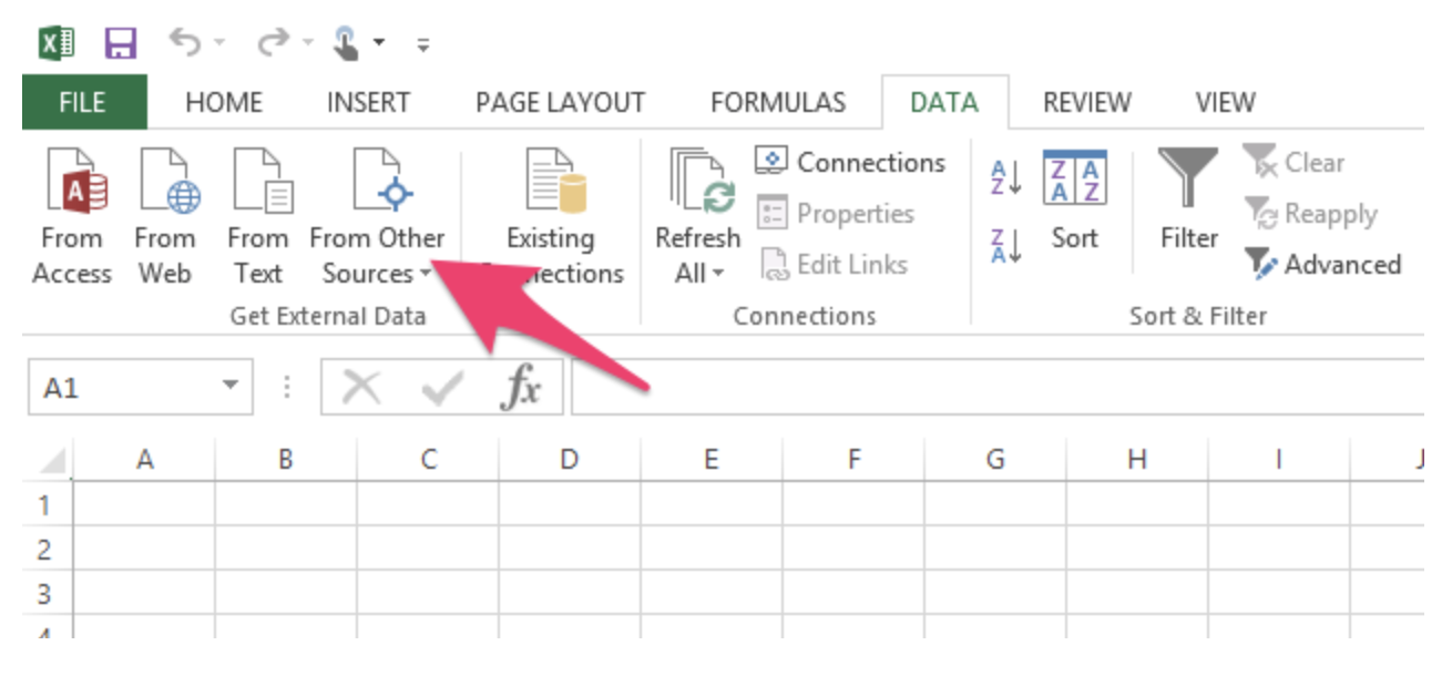 Open Excel and under the DATA section, click “From Other Sources”, and select “From Data Connection Wizard”.
