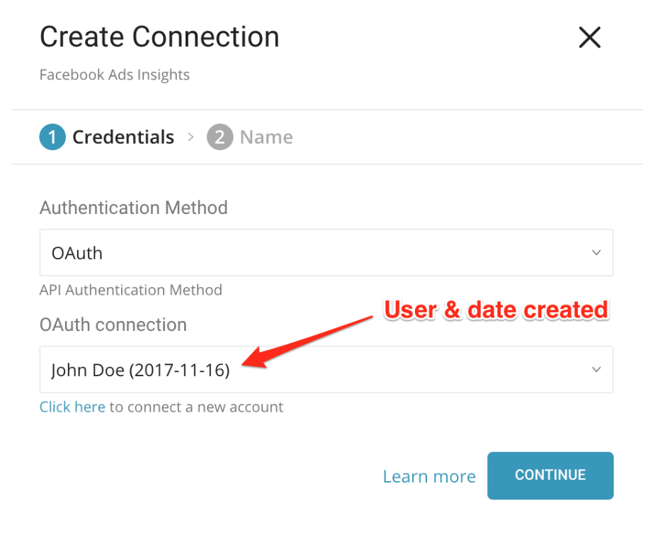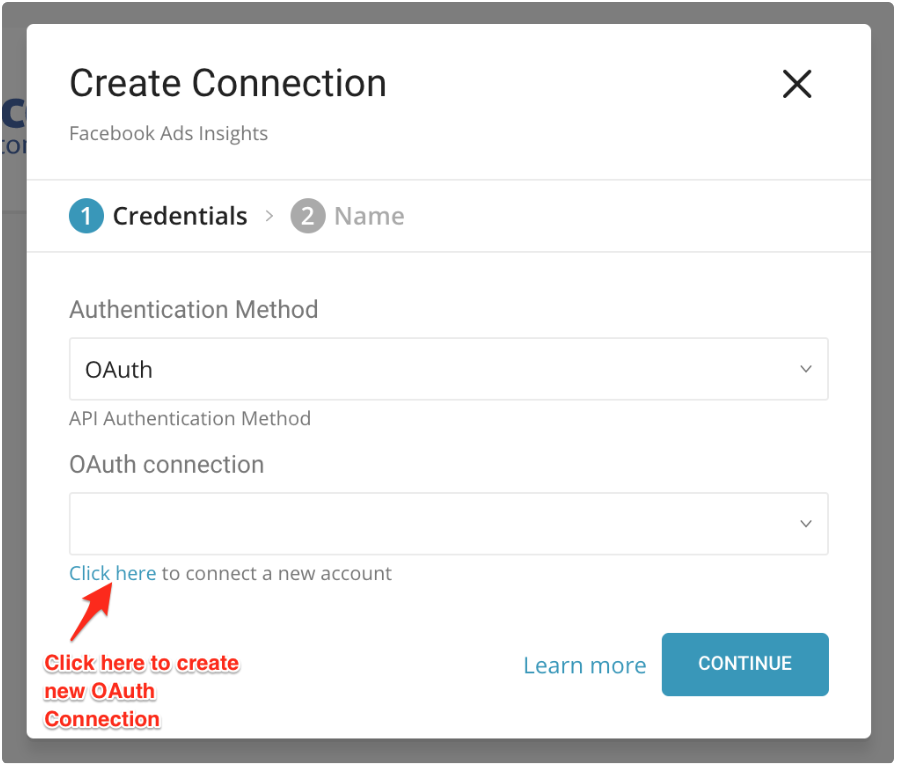 Select an existing OAuth connection for Facebook or select the link under OAuth connection to create a new one.