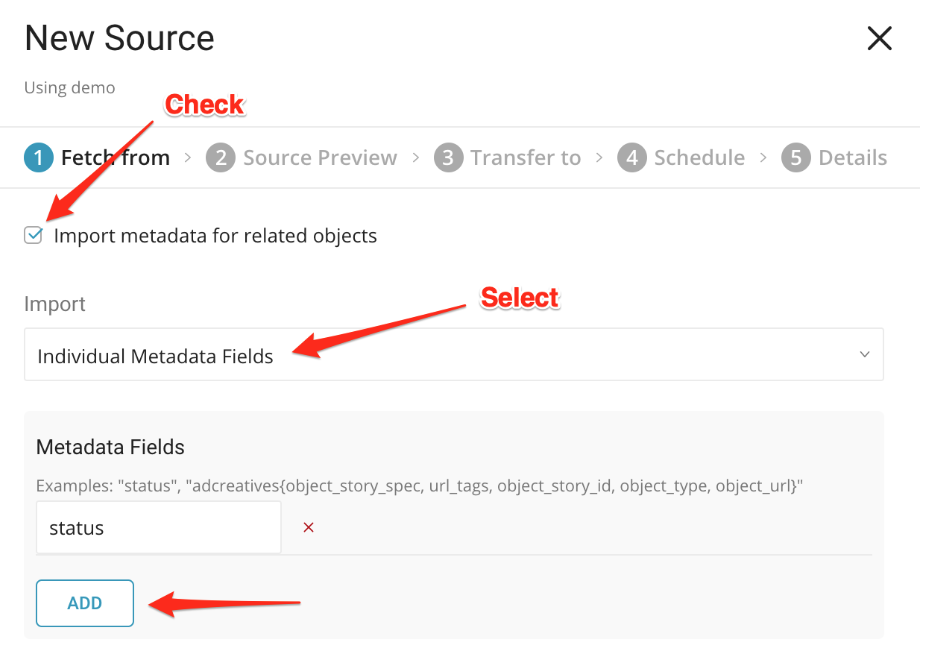 Metadata fields associated with the Ads objects. Selecting Individual Metadata Fields allows you to import only the fields you want. Select fields under Metadata Fields.