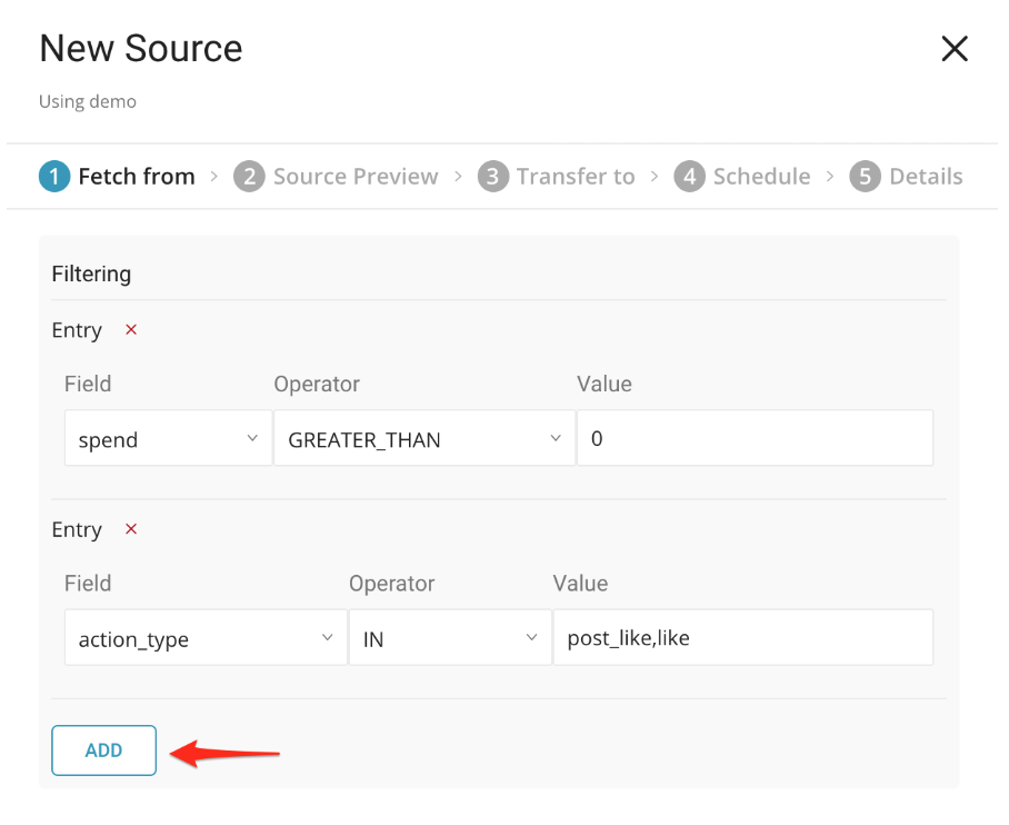 Filters on the reported Insights data. Format: Field —> Operator —> Value, the action_type supports IN operator with comma separate values, i.e. post_like, like