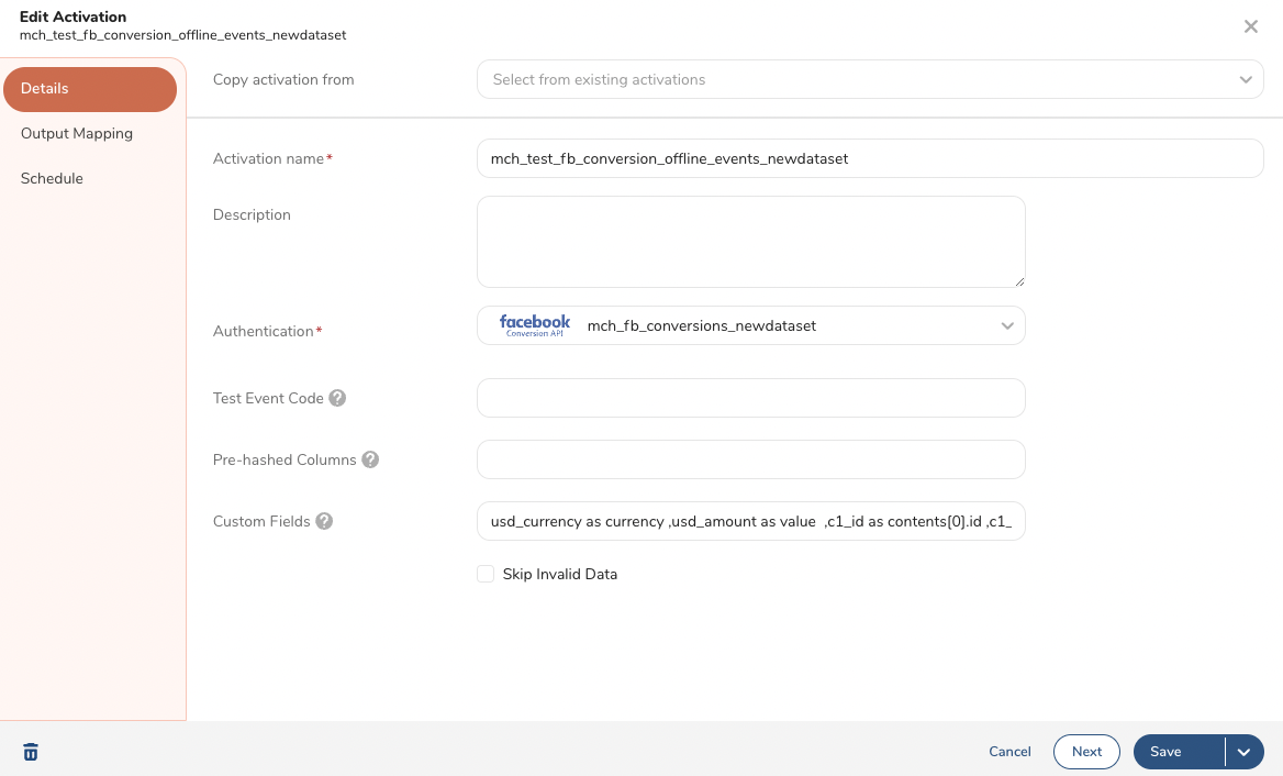 TD Console starts the activation on Facebook by sending an API call to Facebook with a request payload that contains information like telephone number, email address, item list, currency, etc. Here is an example of the API call. For additional information see the Meta documentation Sending Offline Events Using the Conversions API.