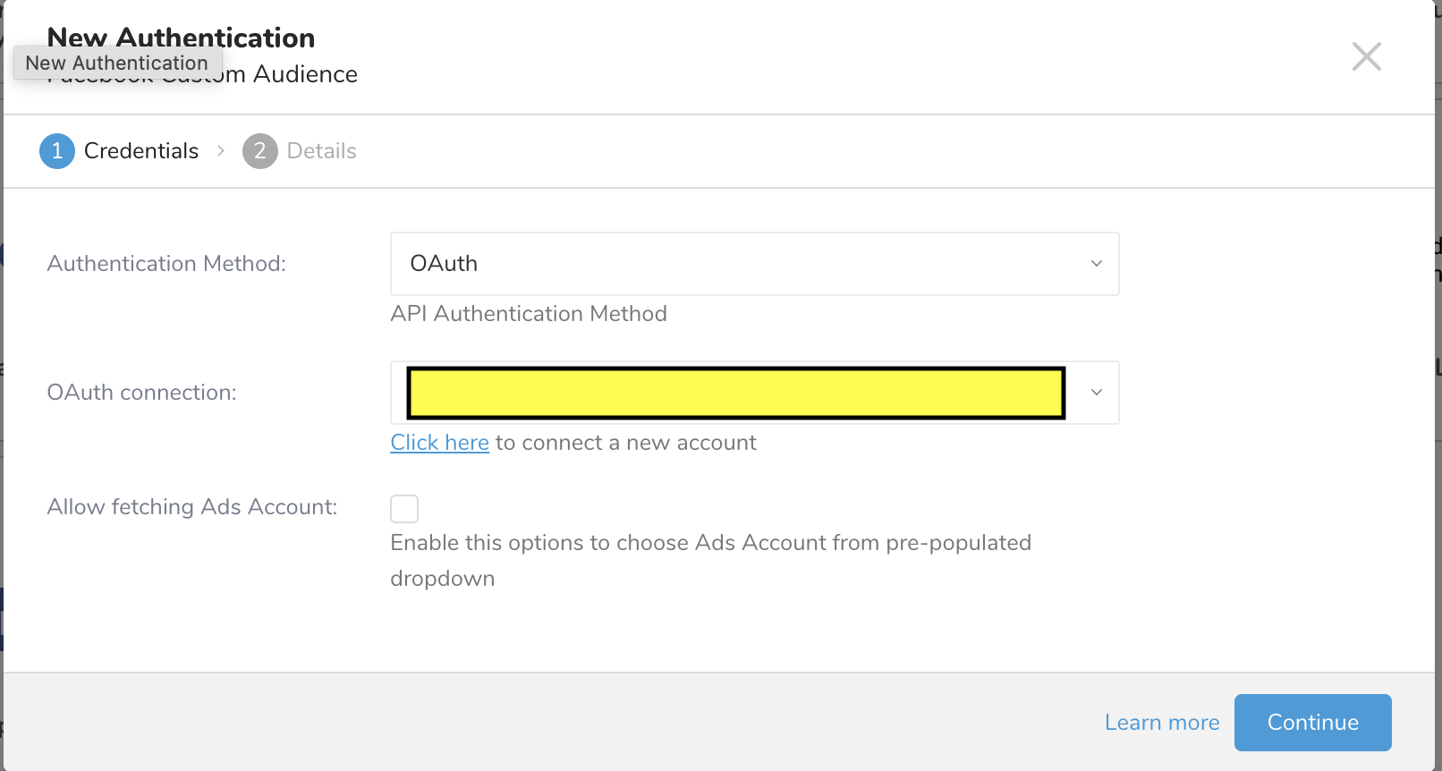 An authentication for Facebook Custom Audience needs to be established before exporting your data to the target platform. Here are the steps to create an authentication.
