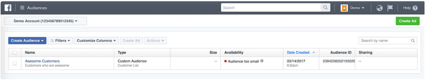 When you upload or create a Custom Audience, Facebook requires that you accept Custom Audience Terms. You see a notification when you export an ad object targeting a customer file or export value-based Custom Audiences. You receive subsequent reminders about Facebook Custom Audience terms every 90 days. For more information, see Better Facebook Ads ROI with Data-Driven Custom Audiences.