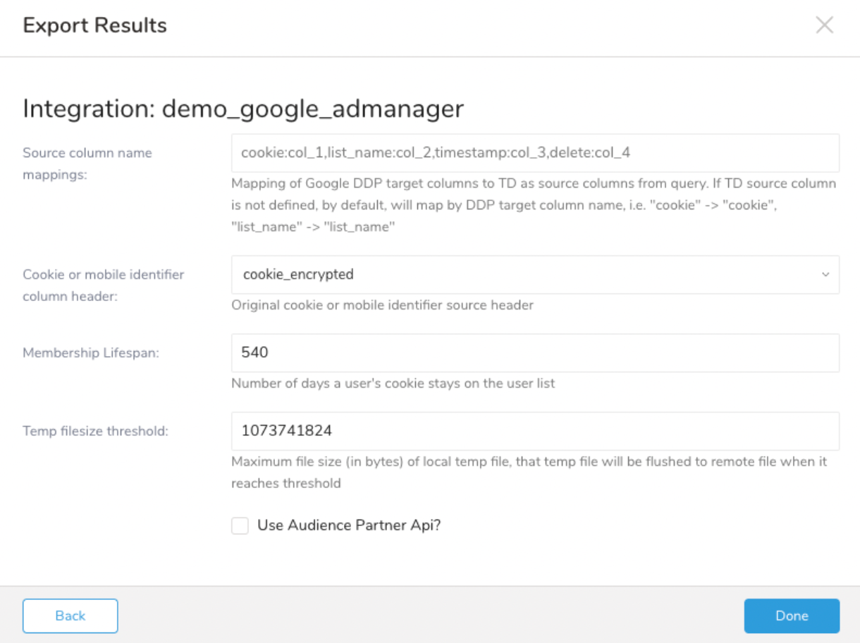 For example, if google_cookie is the identifier column in your TD data source, you should define the mapping as a cookie:google_cookie. If the source column in the mapping is missing, the target column name will be used. For example, a cookie is the same as a cookie:cookie mapping.