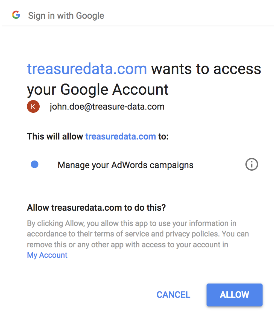 Select it to connect a new account. Log into your Google AdWords account from the new window and grant Treasure Data access to your Ads campaigns: