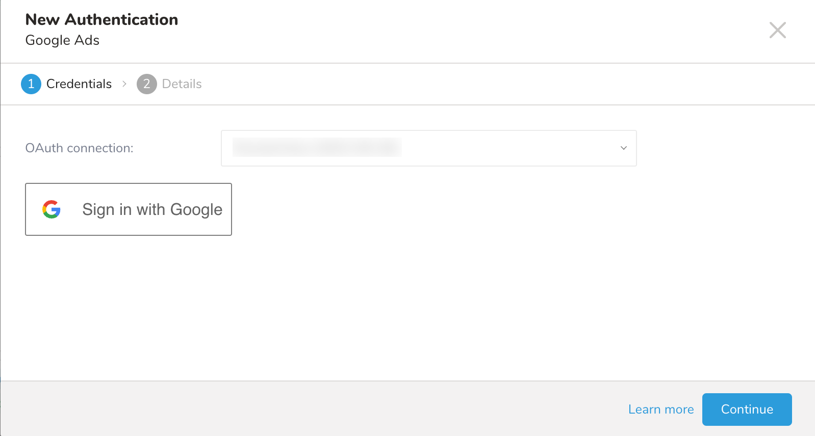 In the field Ad Account, enter the Customer ID in your Google Ads console UI.
