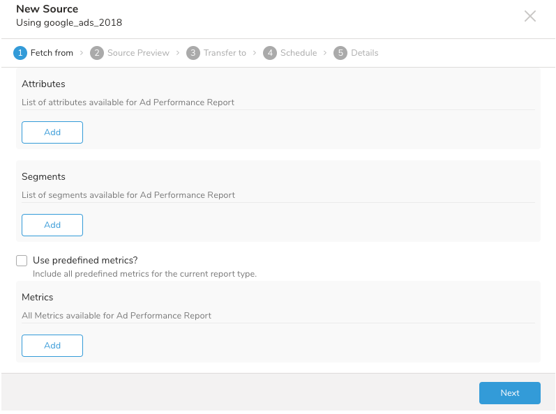 start_date: From which date (yyyy-MM-dd) report data to be generated. This field is required ifcustom_dateis selected fordate_range.end_date: To which date (yyyy-MM-dd) product data to be imported. This field is required ifdate_rangeiscustom_date.include_zero_impressions:truemeans accepting all rows that have no impressionincremental: Support incremental loadingcolumns: List of attributes, segments and metrics to be collected- See the Appendix for the list of available