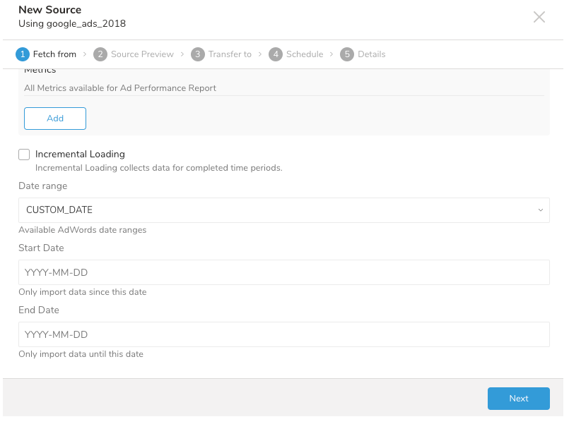 By enabling incremental loading, you can schedule the data loading during a time period that you specify. Note that data is fetched only when the full period of time (automatically computed based on the Date Range value) is complete.