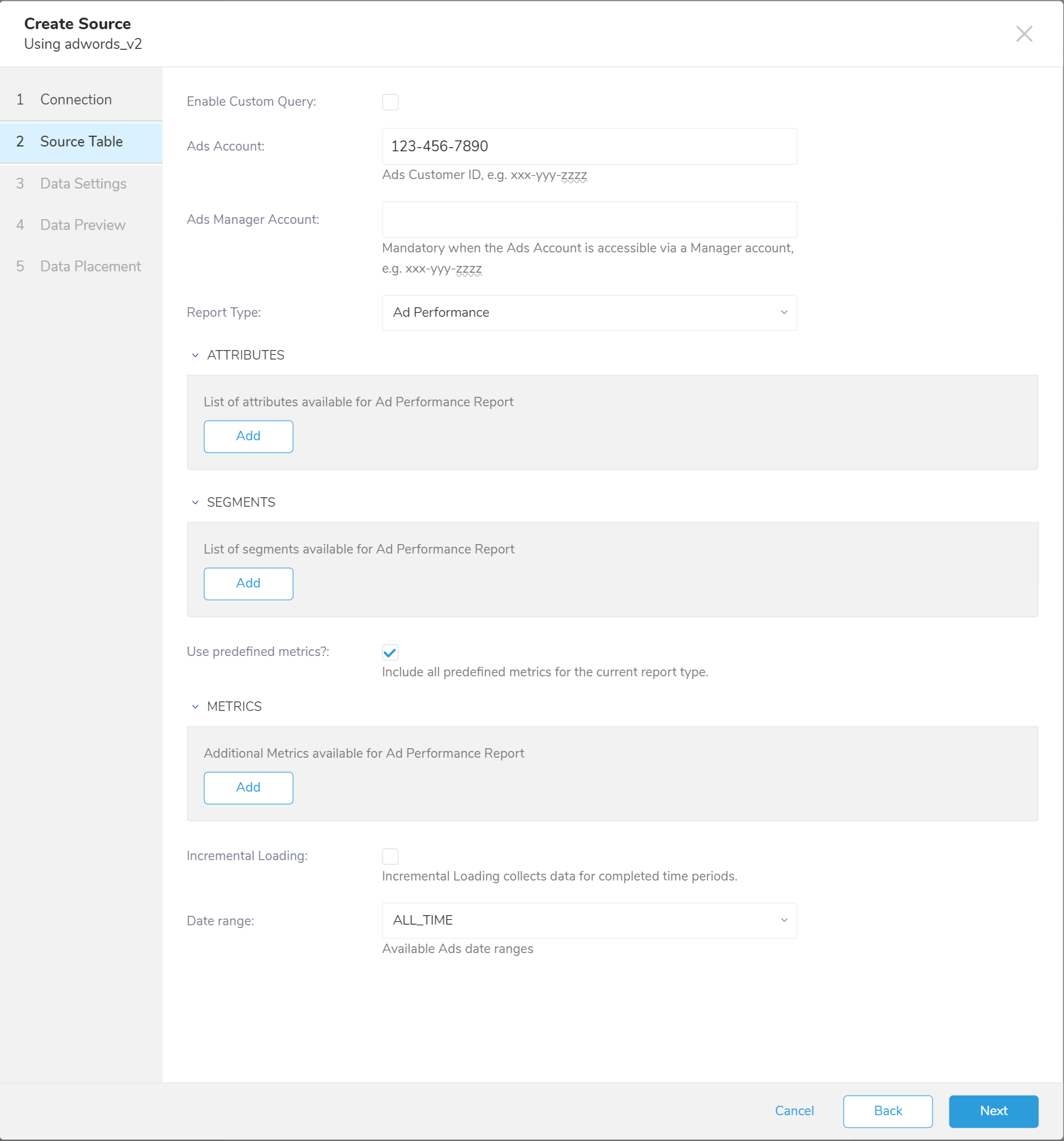 | Enable Custom Query | Required | boolean | With this option enabled, a custom query can be used to declare the target data source. Refer to Google Ads Query Builder for more details. Otherwise, choose one of the pre-defined report types, and pick up the desired Attributes, Segments, and Metrics. |