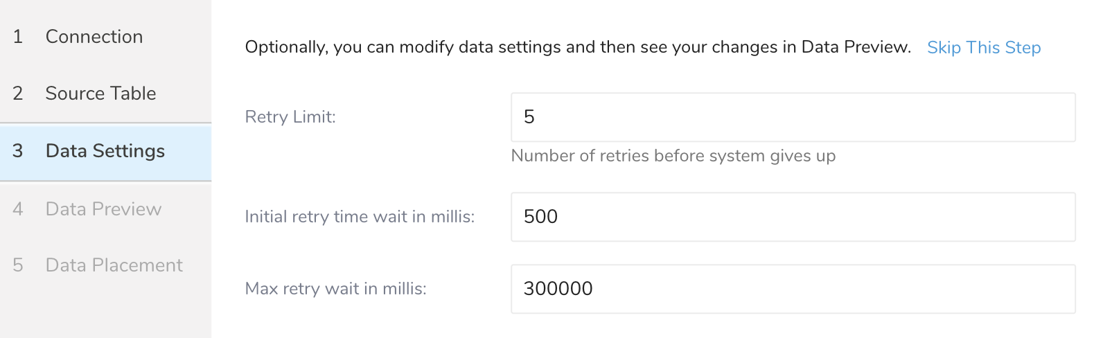 | Max retry wait in millis | Required | int | Maximum retry waiting time in milliseconds. Default: 300,000ms. |