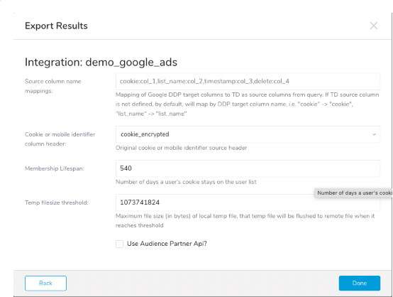 Define the mapping between Google DDP column names and the output column names you specify in your query. You select the target column and then the source column. For example, if google_cookie is the identifier column in your TD data source, you should define the mapping as cookie:google_cookie. If the source column in the mapping is missing, the target column name will be used. For example, cookie is the same as cookie:cookie mapping.