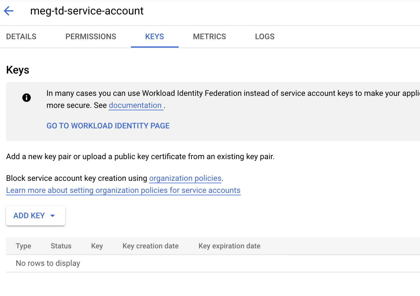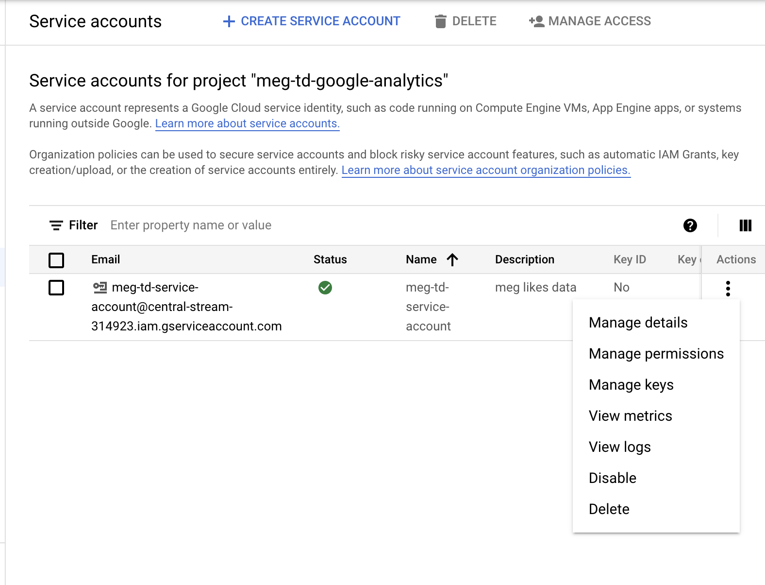 json keyfile and search forclient_emailfield to collect the service account email address. It might look similar to the following address:"client_email": "meg-td-service-account@central-stream-314923.iam.gserviceaccount.com".Sign in to Google Analytics https://analytics.google.com.