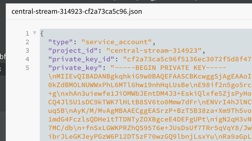 Locate and open the JSON file that you downloaded from the Google Cloud Platform in your favorite text editor. For example: