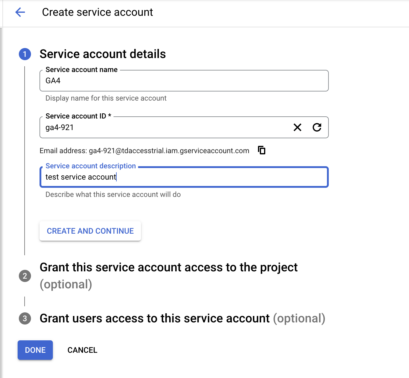 Complete the fields in step 1 to create the service account. You can skip the two optional parameters.