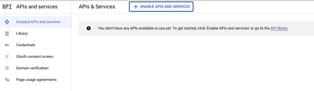 Enable the Google Analytics Data API v1. Navigate to the APIs & Services for your project, then select + ENABLE APIS & SERVICES