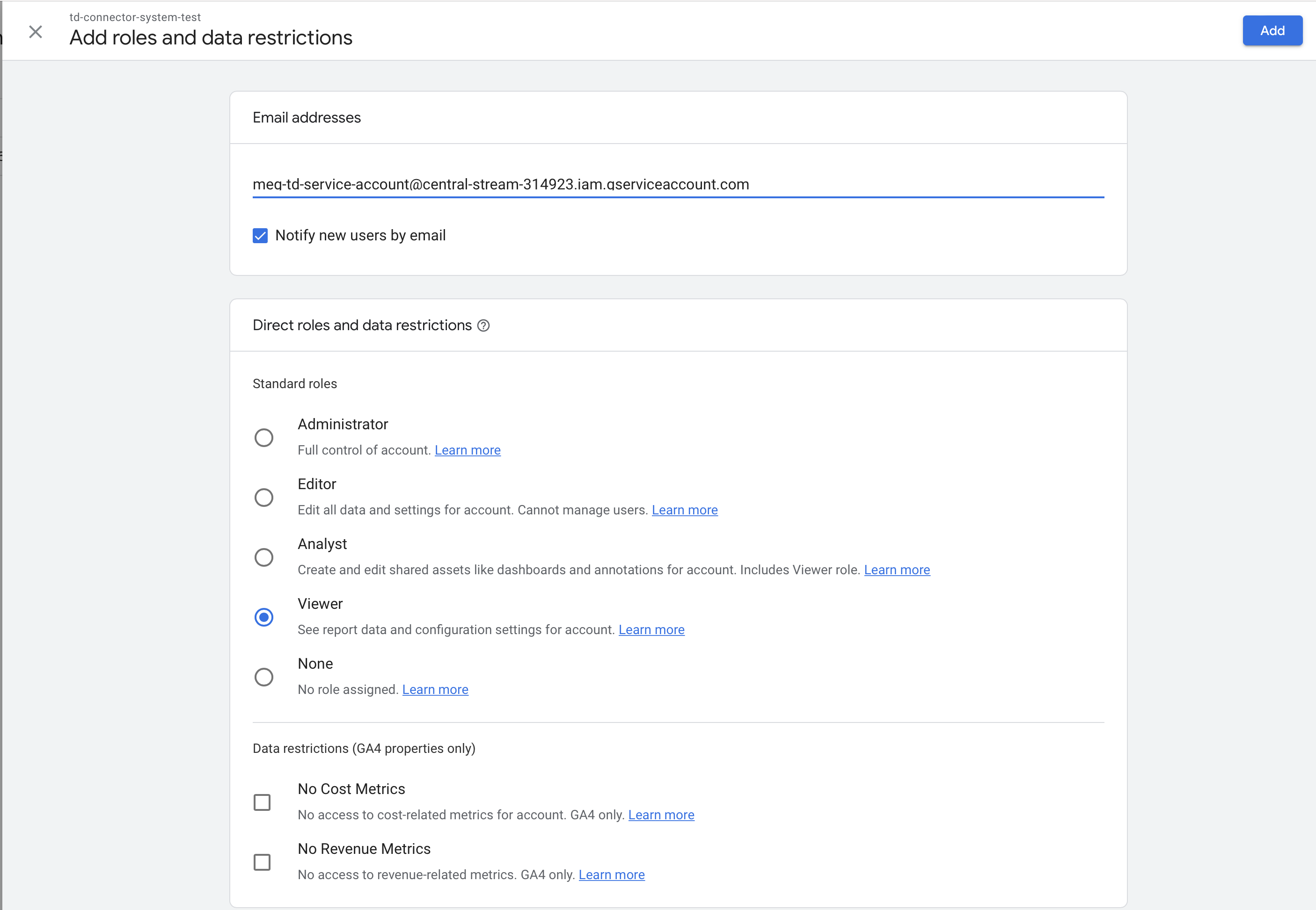- Enter the email address you set aside from json key. Select Viewer role or higher (Analyst, Editor, Administrator). Select Add. Your service account now has access to use Google Analytics 4 through the Google Analytics Data APIs.