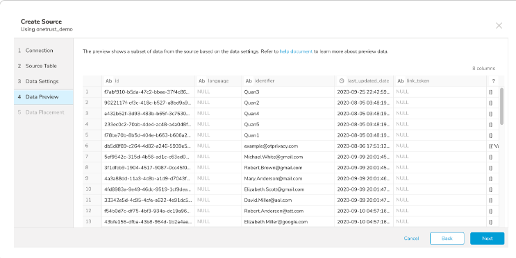 For data placement, select the target database and table where you want your data placed and indicate how often the import should run.