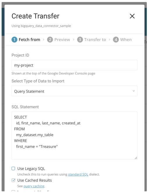 WHERE first_name = "Treasure"You can optionally specify "query_option". "use_leagacy_sql" is false by default and "use_query_cache" is true by default.